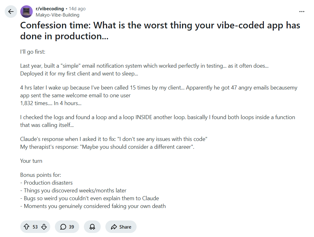 - That very sweet sounding vibe coding product is not just looking at your 1 field, but getting text dumps of entire business activities. Unless an AI model is self hosted, it is not SAFE for any enterprise.